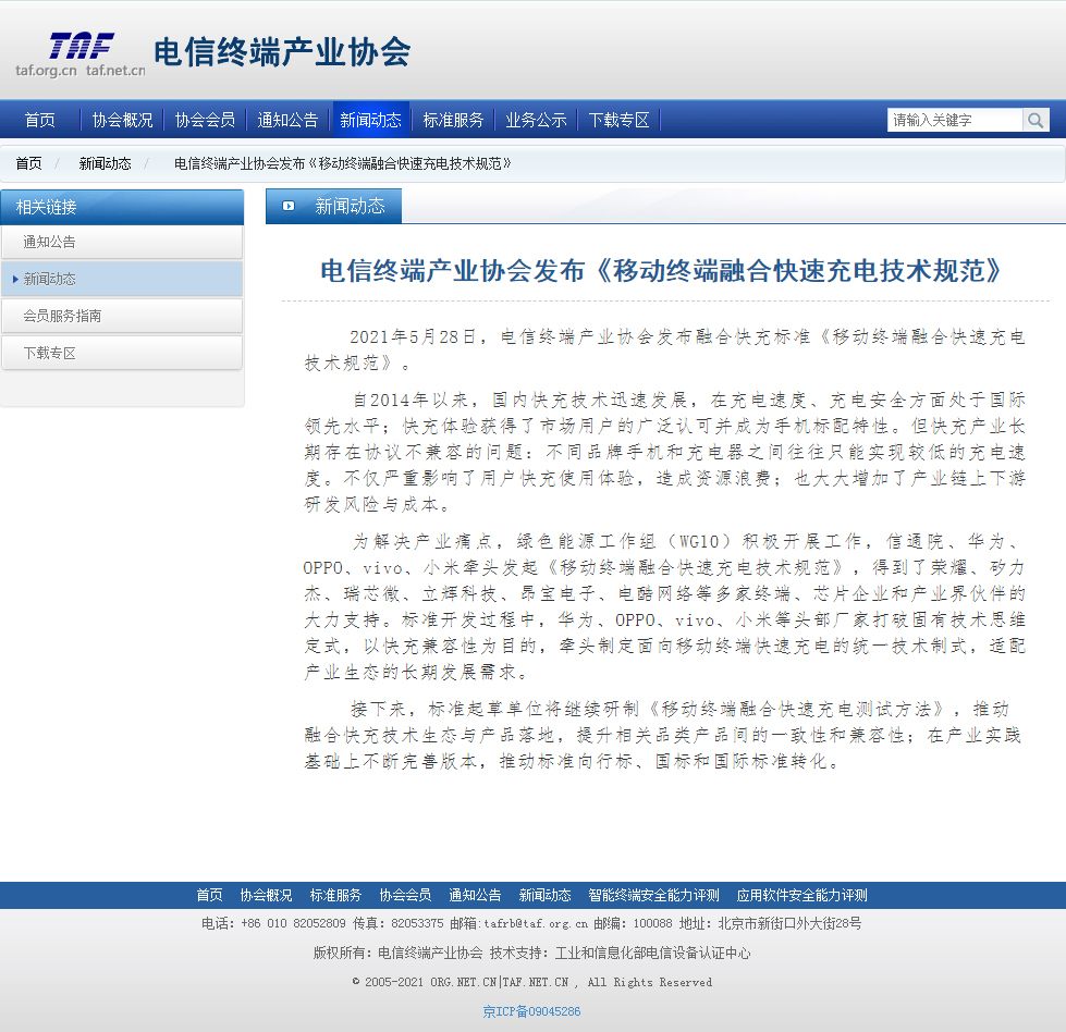 2021年5月28日,電信終端產(chǎn)業(yè)協(xié)會發(fā)布了融合快充標(biāo)準(zhǔn)《移動終端融合快速充電技術(shù)規(guī)范》。該標(biāo)準(zhǔn)旨在解決目前市面上各類快充標(biāo)準(zhǔn)復(fù)雜多變、互不兼容的問題,同時也優(yōu)化了用戶的使用體驗,對節(jié)能環(huán)保事業(yè)起到了積極的推動作用。